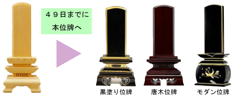 本位牌(黒塗り位牌、唐木位牌、モダン位牌など)をする時期は、一般的に49日法要(忌明け法要)までとなります。
