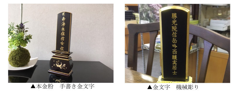 当店では、「機械彫り」「機械書き」「手書き」の3つの方法で文字入れを行っております。お位牌を新調いただいた方には「機械彫り」「機械書き」の場合、1霊分無料にて、「手書き」の場合は1霊につき2,200円をいただいております。